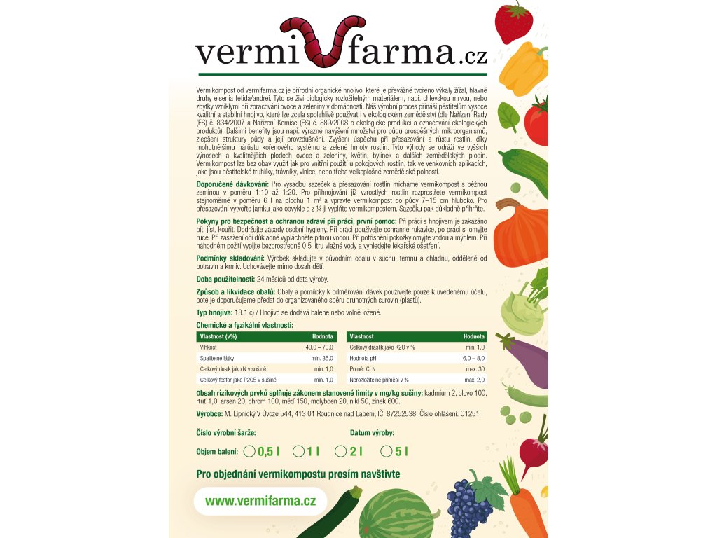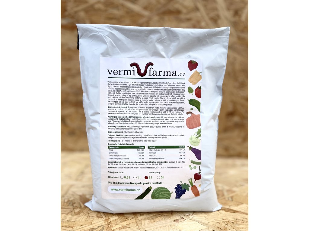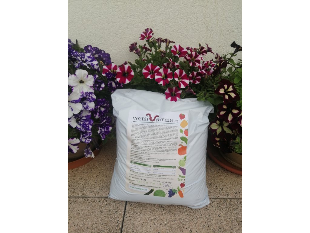 Vermikompost od vermifarma.cz je zcela přírodní organické hnojivo, které je převážně tvořeno výkaly žížal. Náš výrobní proces přináší pěstitelům vysoce kvalitní a stabilní hnojivo, které lze zcela spolehlivě používat i v ekologickém zemědělství. Náš vermikompost výrazně navyšuje množství pro půdu prospěšných mikroorganismů, zlepšení struktury půdy a její provzdušnění, což zvyšuje úspěšnost při přesazování a růstu rostlin, hlavně díky mohutnějšímu nárůstu kořenového systému a zelené hmoty rostlin.
